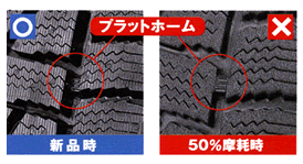 ●右写真のように、スタッドレスタイヤの溝には約50%タイヤが摩耗すると現れるサインがあります。これはプラットホームと言って、スタッドレスタイヤとしての性能はここまででおしまいですという時期を知らせてくれるものなんですが、残り溝1.6mm以下になると現れるスリップサインとは違い、メーカーが独自に採用したもので、特にこのサインが現れたからといって整備不良とかでキップを切られることはありません。