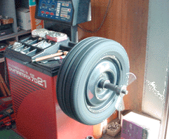 ●空気が充填し終わったら、ホイールバランサーにタイヤをセットし、タイヤを回転させてバランス調整をします。 ●アルミホイールでバランスウェイト(重り)が表から見えないように止める場合は、ホイールの内側に板状のウェイトを両面テープで止めます。 |